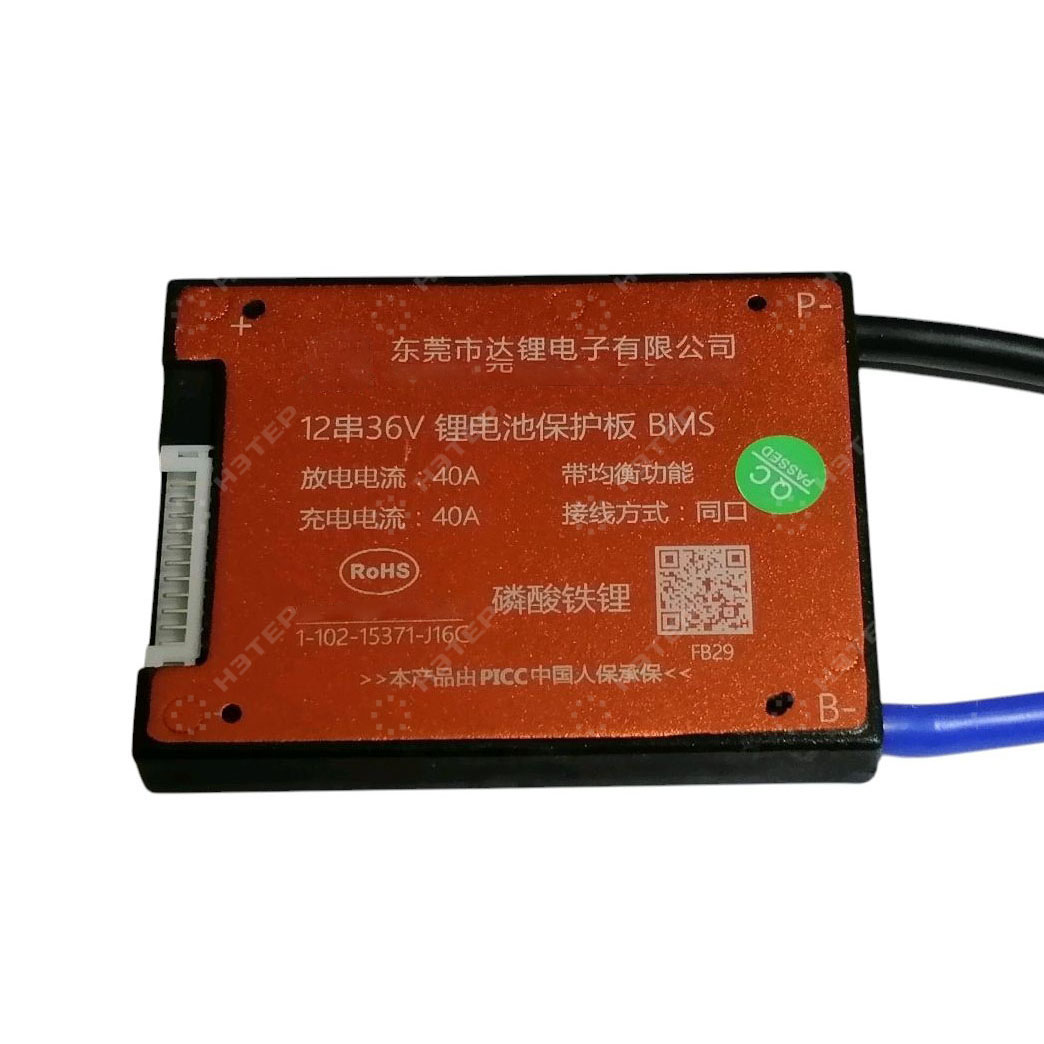 К модулю контроллера заряда-разряда BMS-12S.38,4.40 с балансиром последовательно подключаются 12 элементов питания (ячеек). BMS имеет защиту от короткого замыкания, перезаряда и переразряда. Одна из функций контроллера заряда — отключение питания аккумуляторов при достижении максимальной емкости хотя бы одной ячейки. Максимально допустимый ток разряда — 40А.